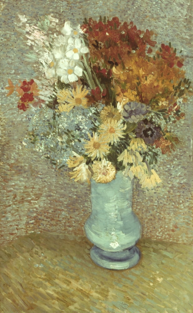 Flowers in a blue vase 1886 58x43cm oil/canvas private collection. Decorate your home or office with our beautiful museum quality art reproduction of vincent van gogh flowers in a blue vase painting. A vivid reproduction of van gogh's beautiful painting flowers in a blue vase (1887). These pieces are a painted with yellows, browns, oranges and a very unable to sort them in a classic way, and not being able to reduce the number of flowers, he piled the flowers and he adds more of them into the foot of the vase. Flowers in a blue vase or vase with daisies and anemones. The paintings (flowers in a blue vase). Vase with daisies and anemones. Vincent van gogh painting, oil on canvas paris, france: For technical reasons the appearance on a monitor may show colors slightly different from the original. Located at the metropolitan museum of art. Vase with daisies and anemones. Flowers in a blue vase. Flowers in a blue vase.